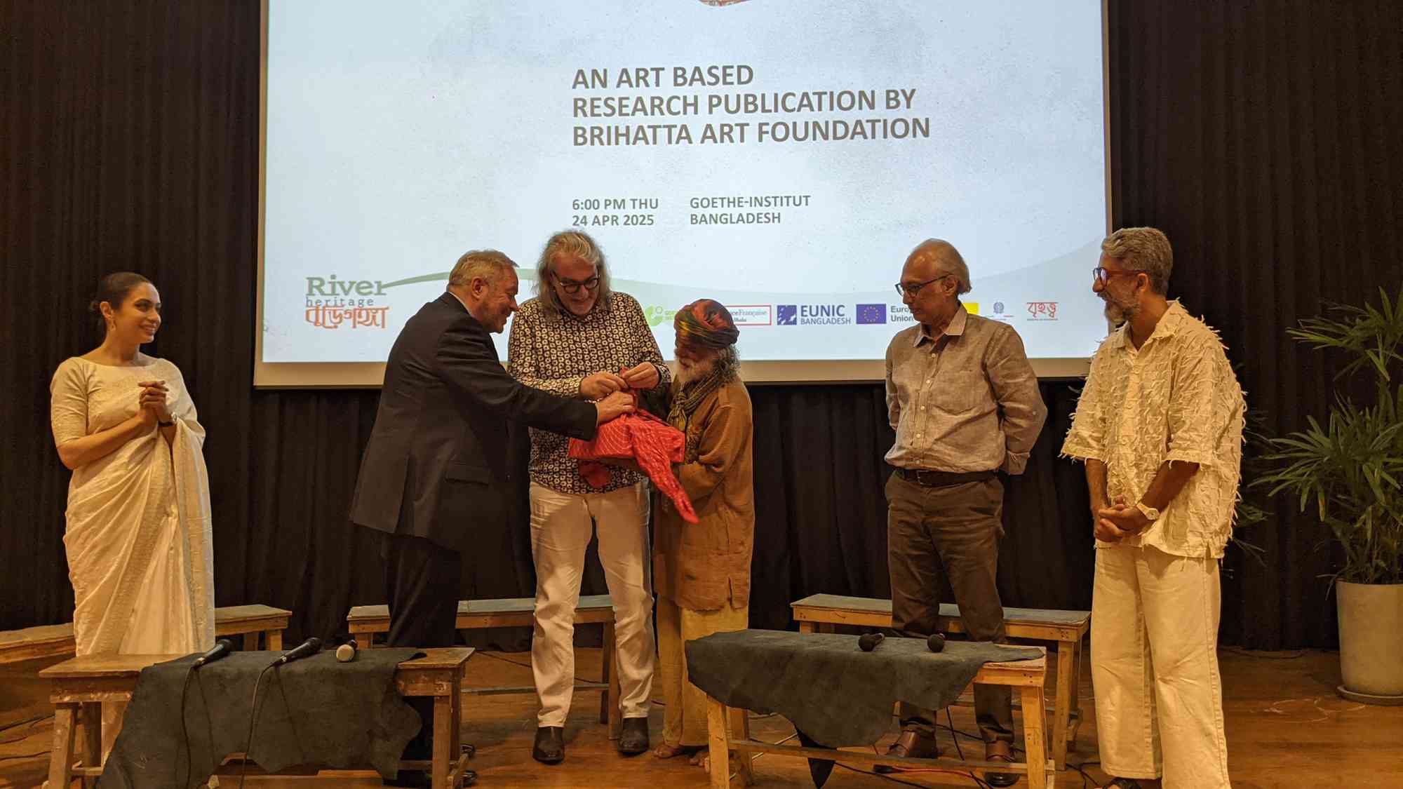 The River Heritage Project_গঙ্গাবুড়ি / Gangaburi is supported by the British Council. An evolution and expansion from previous year’s collective work (2023), ‘গঙ্গাবুড়ি / Gangaburi—the river heritage project,’ has been supported by EUNIC (the European National Institutes for Culture) Bangladesh: the British Council in Bangladesh, Alliance Francaise de Dhaka, Goethe-Institut Bangladesh, EU Delegation in Bangladesh, Embassy of the Netherlands in Bangladesh, and Embassy of Spain in Bangladesh. The title of this project is inspired by the song “Gangaburi” by Kafil Ahmed. The project is directed by Bishwajit Goswami and curated by Shehzad Chowdhury.