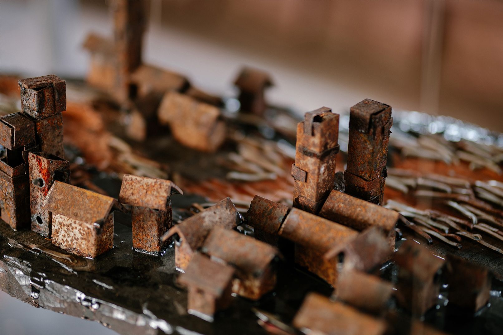 Artist Bilas Mandal visited Buriganga for the first time, and he could not connect to his idea of rivers from his hometown. In his ideas, river ecology, sand bars, and rippling fresh water thrusting the natural banks of the river were met with dark waters of Buriganga, chaos and pollution, dense settlement of migrants, and all things extreme to the nature of his idea of rivers. Thus, the artist tries to draw, compare, and contrast the past and present landscapes of the Buriganga River as the main spine of the life around it. He uses elements like boat staples, a hand-made rowed boat, a propeller, with features of settlements around it to develop his narrative.