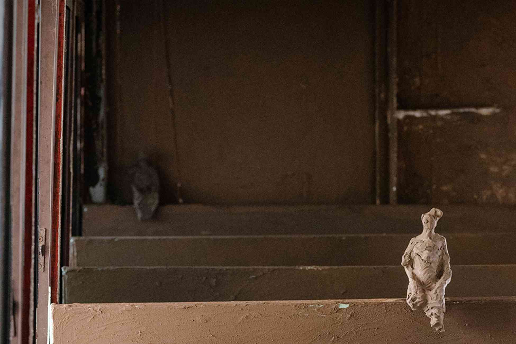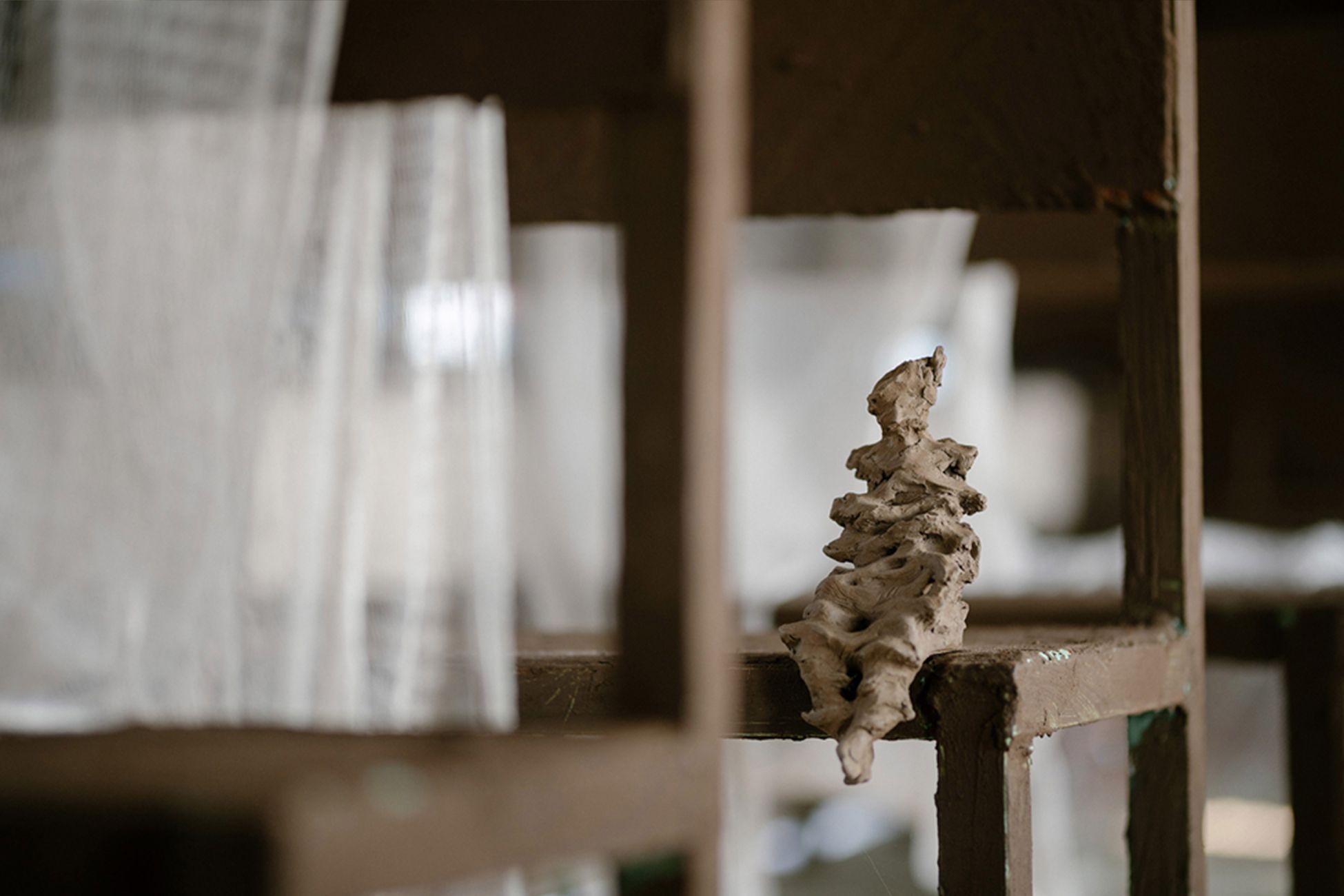 Aonuronon (অনুরণন), meaning “resonance,” reflects the dialogue between Bengal’s rivers and the communities living along their banks. The rivers are revered as sacred, life-sustaining forces that shape traditions, rituals, and songs woven into everyday life. Artist Moni Majhi worked with boatmen from Thotaghat (Buriganga) and Shola artisans from Gandamari village (Khulna) to create a site-specific installation using soil, boat wood, rice flour, straw, sanai, papaya-branch flutes, tree branches, and sewing thread—materials resonating with the delta’s spirit. Inspired by Razib Hasan Chowdhury’s “philosophy of water” (Gangaburi Phase-2 workshop), the work celebrates the enduring harmony between people, nature, and the river.
