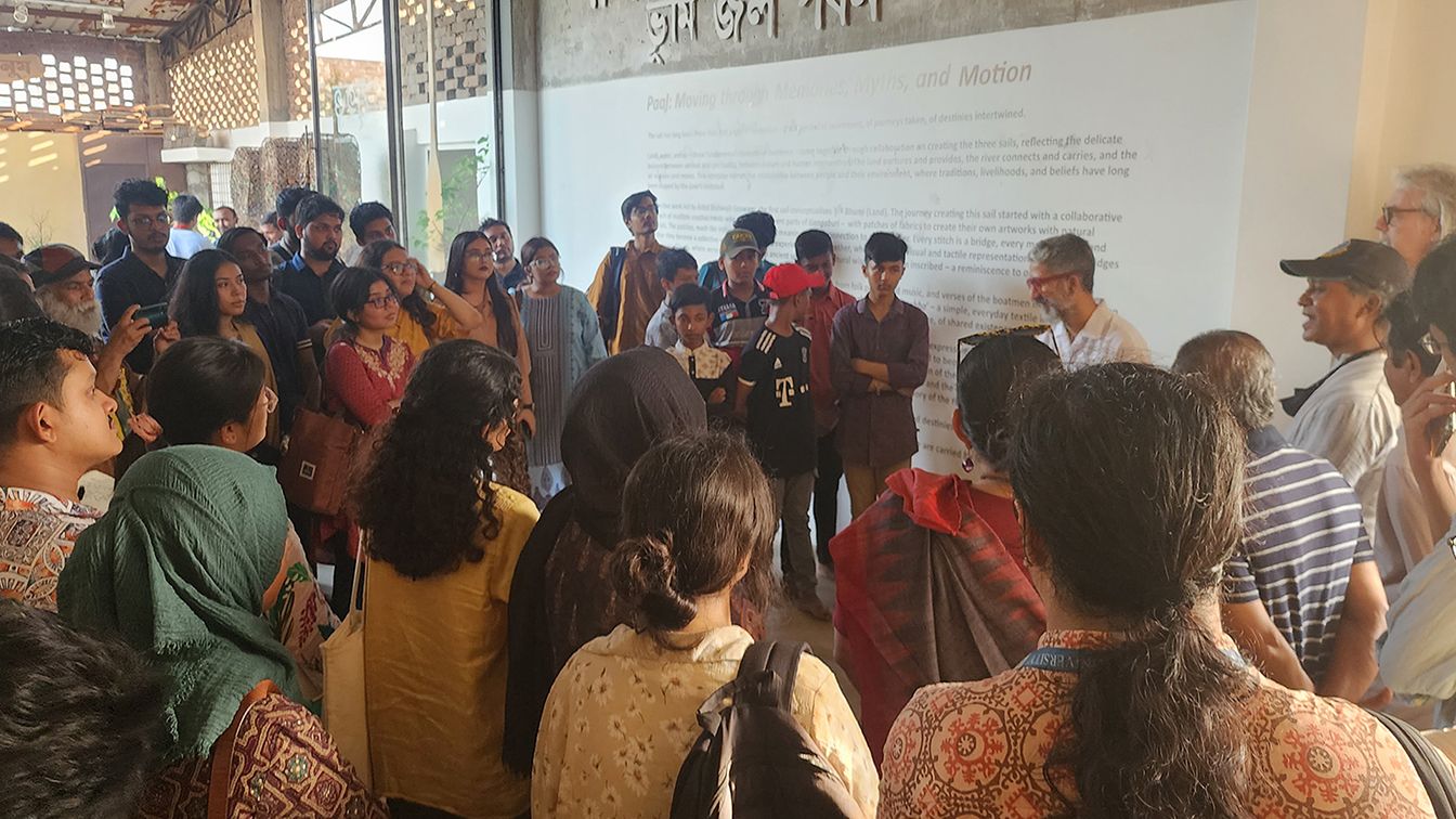A parallel narrative on জল Jol (Water) unfurled on the second sail, where verses from folk poetry and music, and verses of the boatmen inscribed by urban traditional artists who reside near the Buriganga became a part of the composition. Much like the ‘Gamchha’ – a simple, everyday textile imbued with profound cultural connections where the act of weaving becomes an act of remembrance – of rivers, of culture, of shared existence.