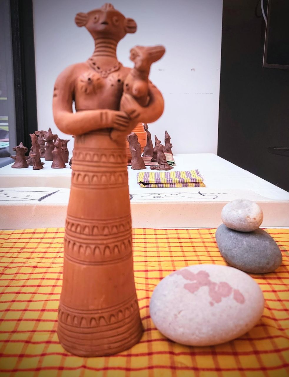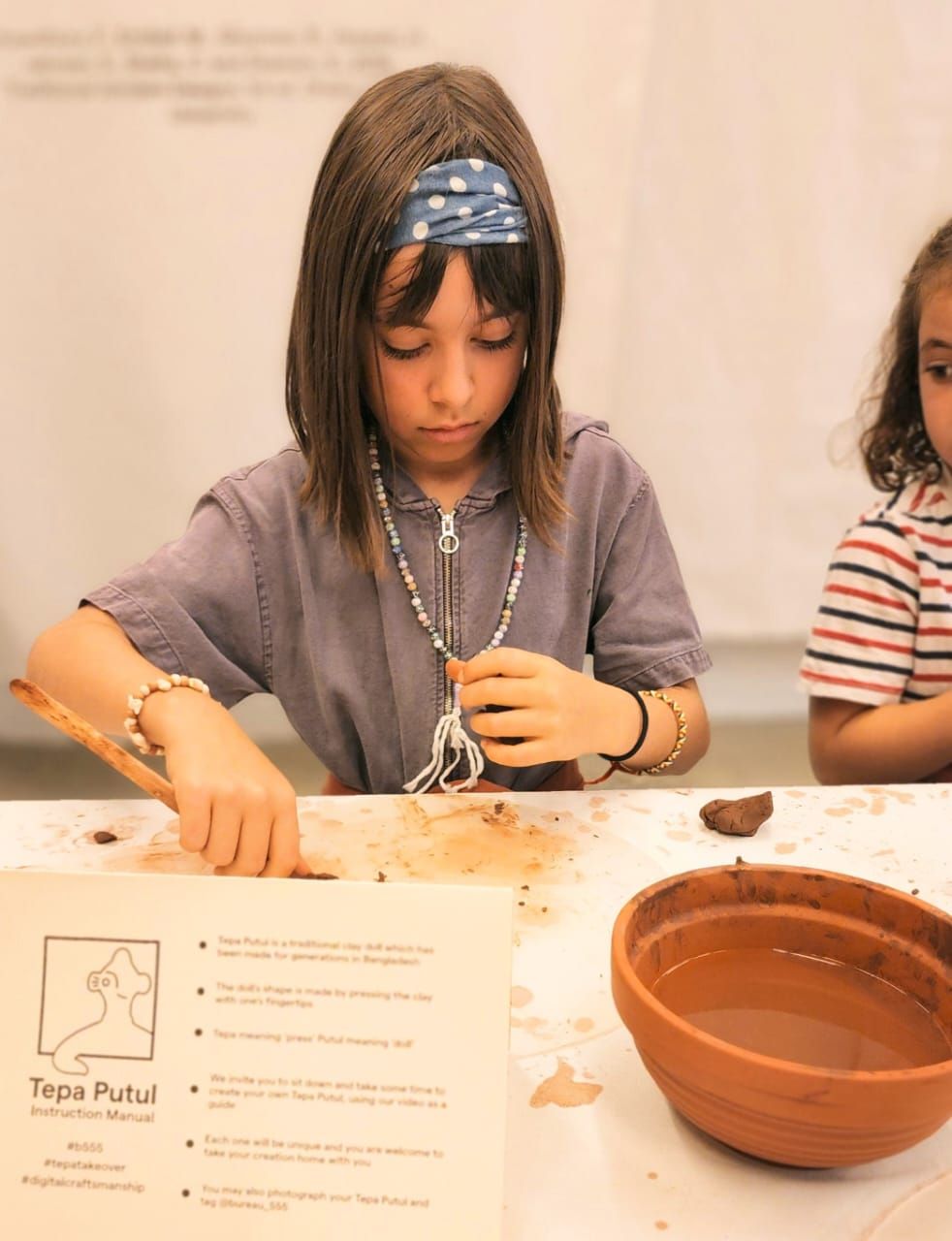 Under the creative direction of Bishwajit Goswami, twelve Jamdani block motifs—hand-carved from locally sourced gamari and mango wood—were created using traditional designs reflecting Bangladesh’s rich textile heritage. The motifs, passed down through generations of master weavers, reference the natural and botanical landscapes of the region. Pigment colours symbolized elements of nature: brown for earth, green for vegetation, and blue for water. Three event-specific 3D characters—Tepa Putul, Tree, and Rainbow—were developed by digital artist Ashrafia Rumman Adib for augmented reality (AR). Visitors could digitise their block artworks, map them onto the 3D characters, and experience their creations in AR. Participants were also guided virtually by artisan Subodh Kumar Pal to make their own Tepa Putul out of clay. This blend of craft and digital technology bridged physical and virtual perception for the audience.