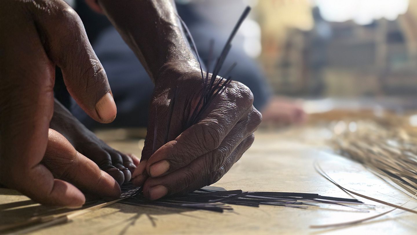 mats by weaving together strips of green cane known as murta. These mats are