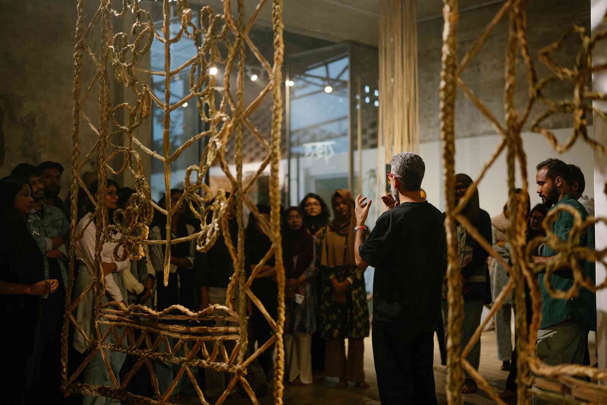 বৈঠক / Baithak, a gathering space for social exchange, invites visitors to sit and share conversations on shitalpati, weaving together memories that emerge from the collective presence of the space. ঝালর / Jhalor, a decorative fringe used in Bangladeshi rituals, adorns sacred spaces and ceremonial textiles. By marking a defined area, it creates a visual and spatial boundary, emphasising that the conversation or gathering beneath it is intentional and significant. Handcrafted by artist Bishwajit Goswami at Brihatta Art Space, Hazaribagh, the Jhalor symbolises auspiciousness and cultural reverence.