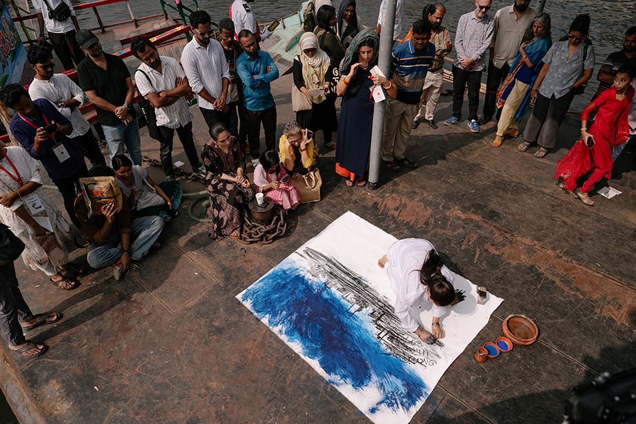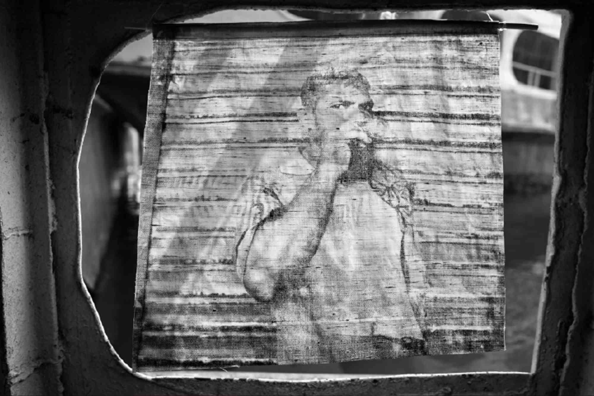 A parallel narrative on জল Jol (Water) unfurled on the second sail, where verses from folk poetry and music, and verses of the boatmen inscribed by urban traditional artists who reside near the Buriganga became a part of the composition. Much like the ‘Gamchha’ – a simple, everyday textile imbued with profound cultural connections where the act of weaving becomes an act of remembrance – of rivers, of culture, of shared existence.