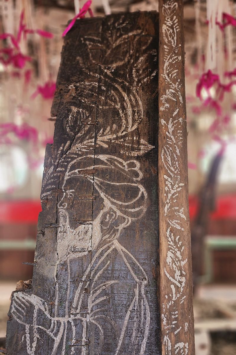 Materials: soil, boat wood, rice flour, straw, sanai, papaya flutes, tree branches,