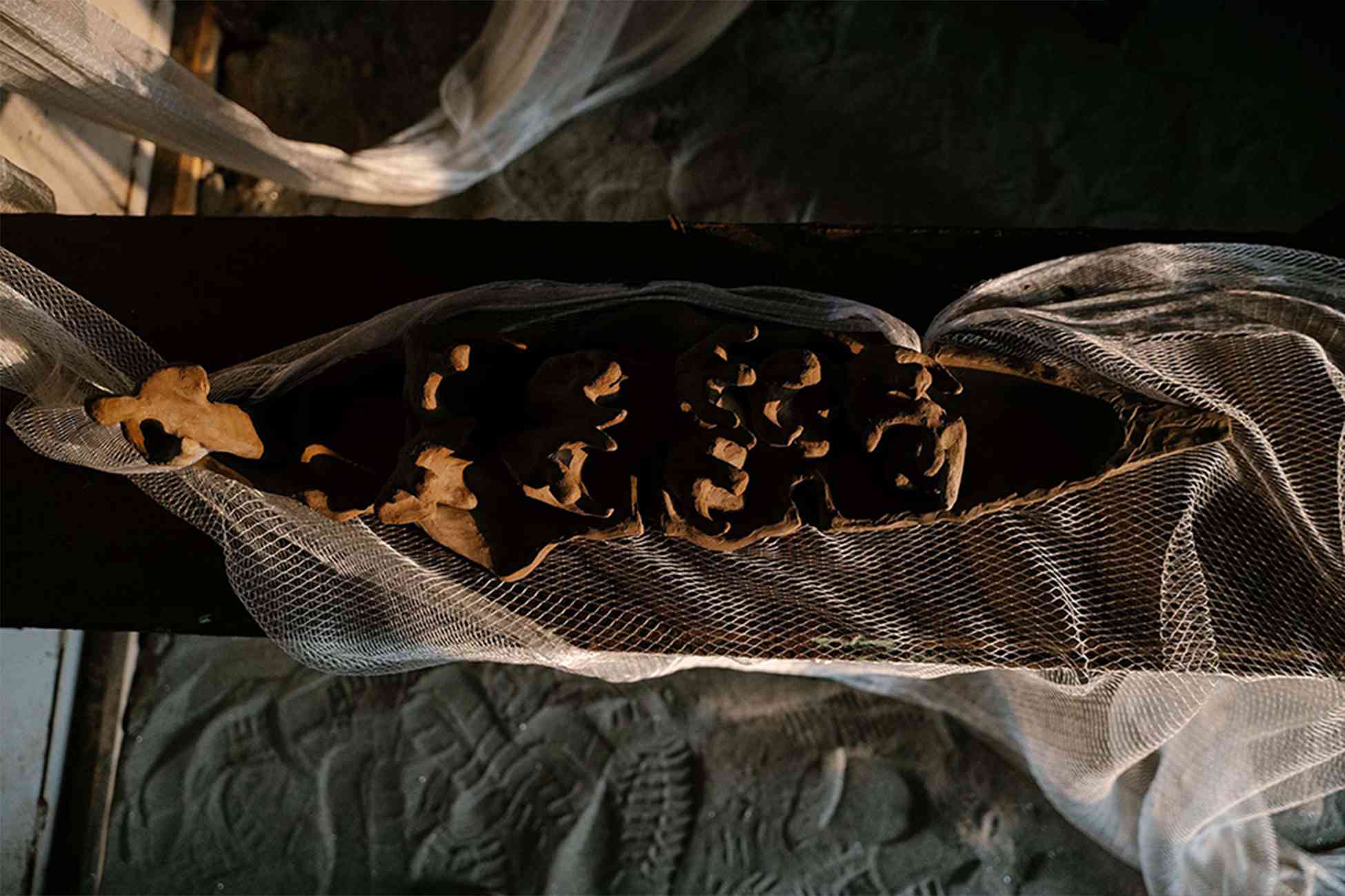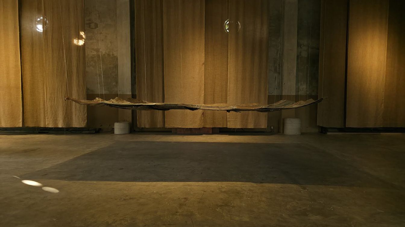 Details of work: Site-specific installation art _ recycled saree, cotton treads, ritual threads, hair of cow, recycled (polythene, lather, cotton cloth, plastic chips) tabiz, coal tar (আলকাতরা), coal powder, clay, brick dust, snails, fluorescent colors, plastic colors, bamboo sticks, fishing nets, paper mashed _ size variable _ 2024