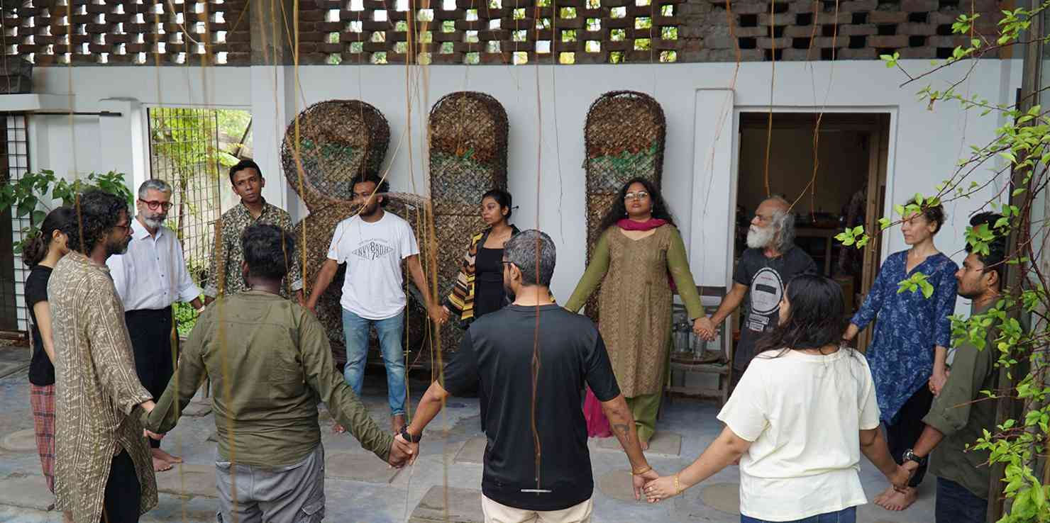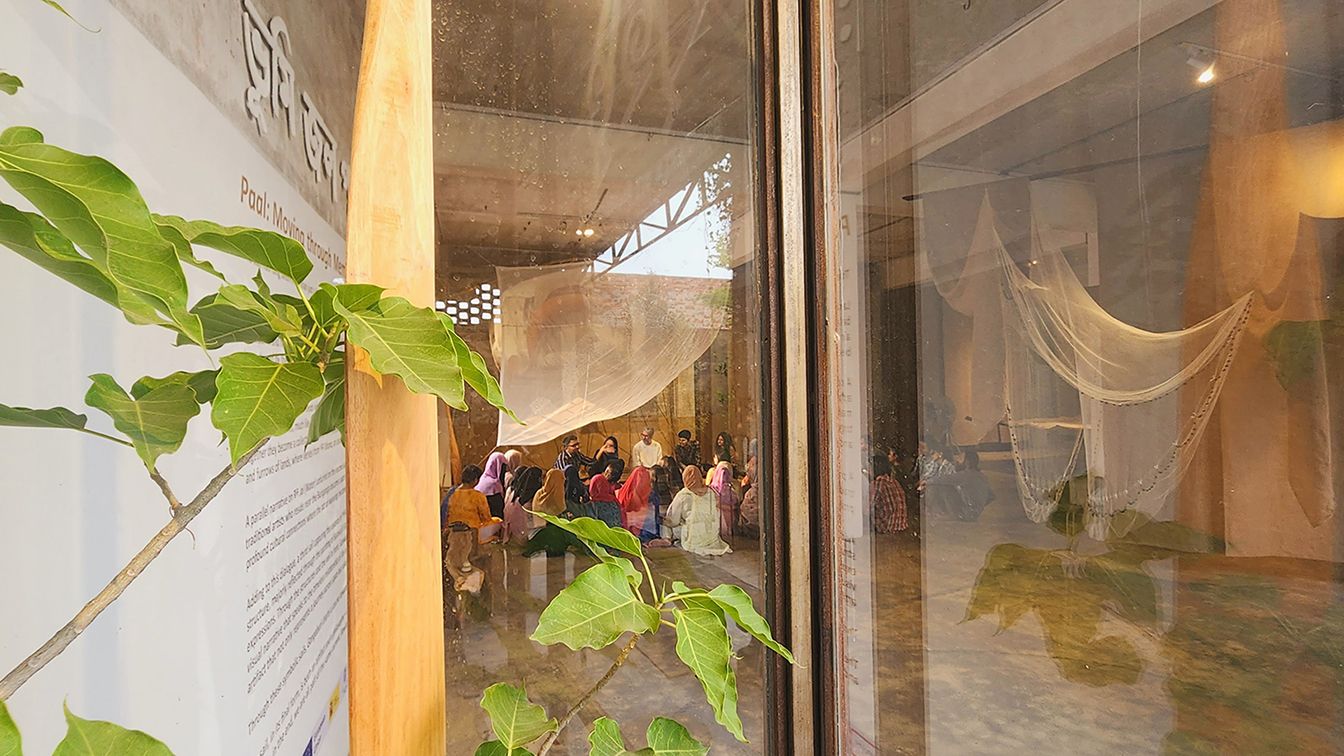 Aonuronon (অনুরণন), meaning “resonance,” reflects the dialogue between Bengal’s rivers and the communities living along their banks. The rivers are revered as sacred, life-sustaining forces that shape traditions, rituals, and songs woven into everyday life. Artist Moni Majhi worked with boatmen from Thotaghat (Buriganga) and Shola artisans from Gandamari village (Khulna) to create a site-specific installation using soil, boat wood, rice flour, straw, sanai, papaya-branch flutes, tree branches, and sewing thread—materials resonating with the delta’s spirit. Inspired by Razib Hasan Chowdhury’s “philosophy of water” (Gangaburi Phase-2 workshop), the work celebrates the enduring harmony between people, nature, and the river.