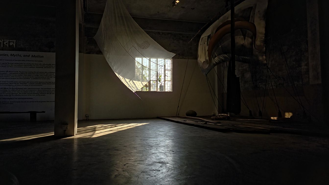 Adding to this dialogue, a third sail capturing the essence of পবন Paban (Air) blends the themes through bold, expressive strokes. The installation of the sail structure, majorly reflected through the painting of Bishwajit Goswami transforms the physical form of the sail to become a vibrant testament to nature’s expressions. Through the structures and the veil in front, Goswami captures the fluidity of the river, the motion of the air – weaving these elements into a visual narrative that speaks to the timeless relationship of life and eternity in a surreal approach. The strokes and the elements transform the sail into an artifact that not only represents a journey across space but also across time, anchoring the collective memory of the river and its people.