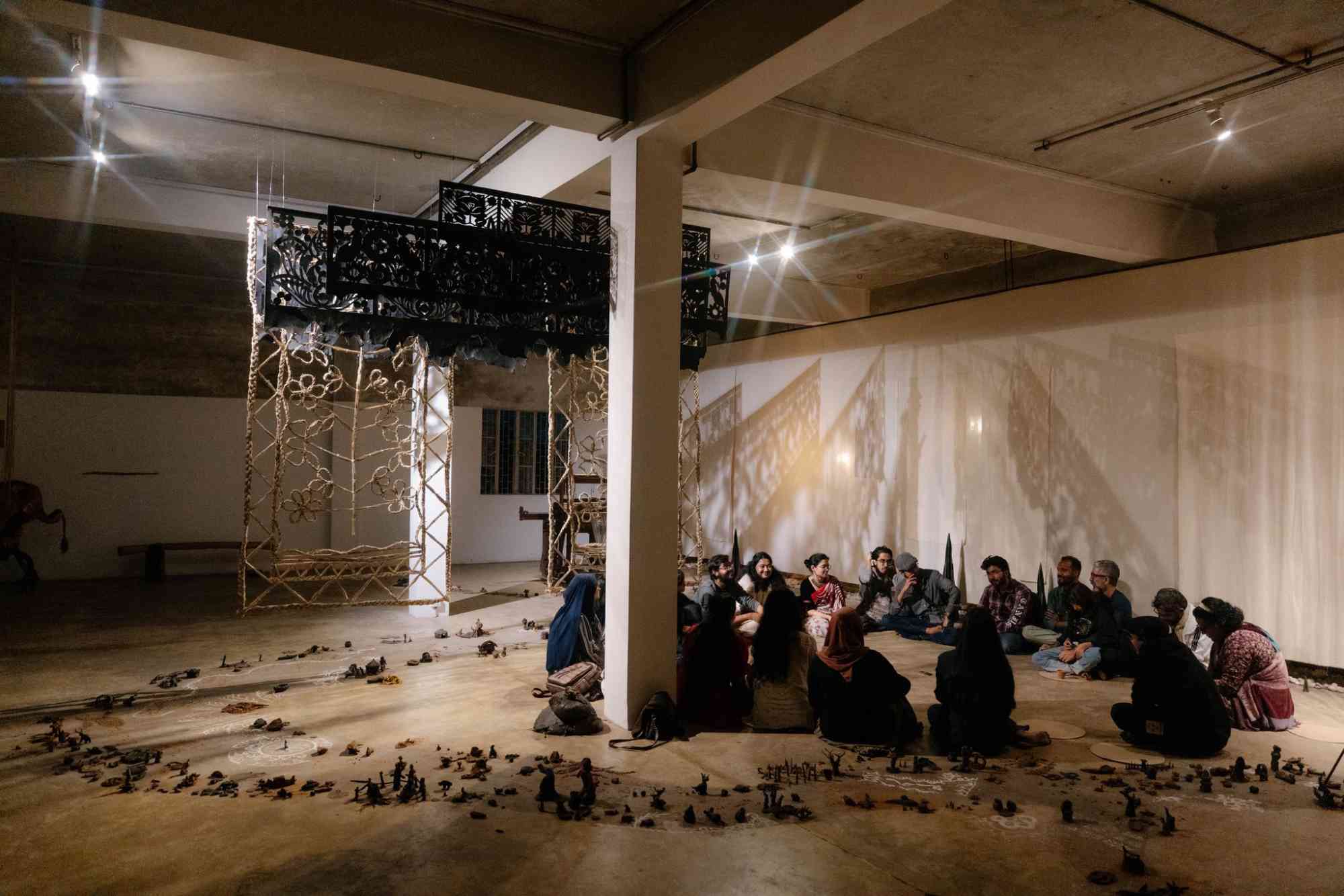 বৈঠক / Baithak, a gathering space for social exchange, invites visitors to sit and share conversations on shitalpati, weaving together memories that emerge from the collective presence of the space. ঝালর / Jhalor, a decorative fringe used in Bangladeshi rituals, adorns sacred spaces and ceremonial textiles. By marking a defined area, it creates a visual and spatial boundary, emphasising that the conversation or gathering beneath it is intentional and significant. Handcrafted by artist Bishwajit Goswami at Brihatta Art Space, Hazaribagh, the Jhalor symbolises auspiciousness and cultural reverence.